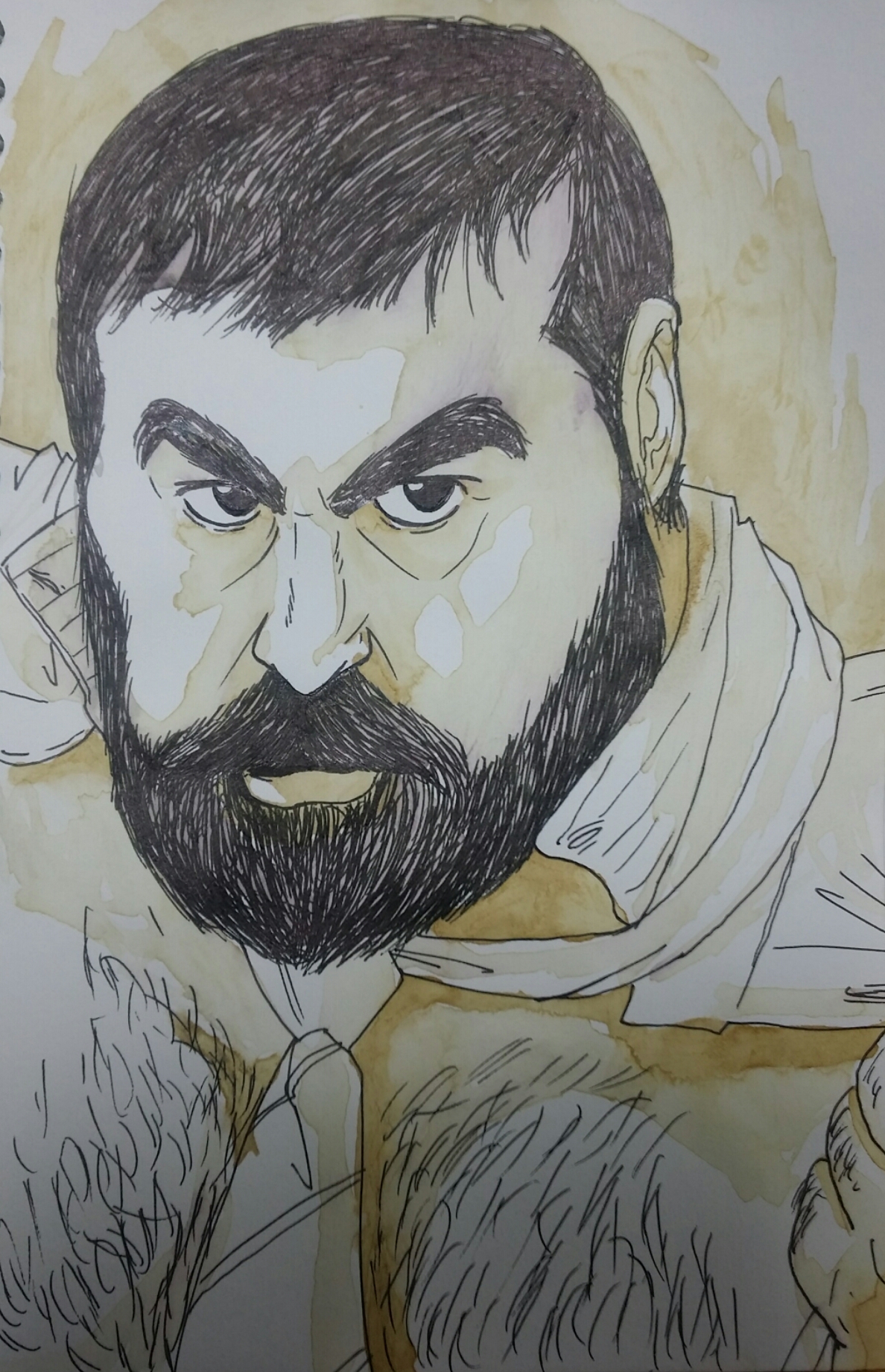 Quelques fois dans mon boulot, comme aujourd’hui, je dois patienter un petit moment entre 2 épreuves d’une inspection… alors on s’occupe comme on peut. On dessine… Je ne bois pas de café mais je dois dire que c’est assez sympa comme boisson pour ombrer un personnage même si une touillette n’est pas un outil très pratique pour peindre 😉